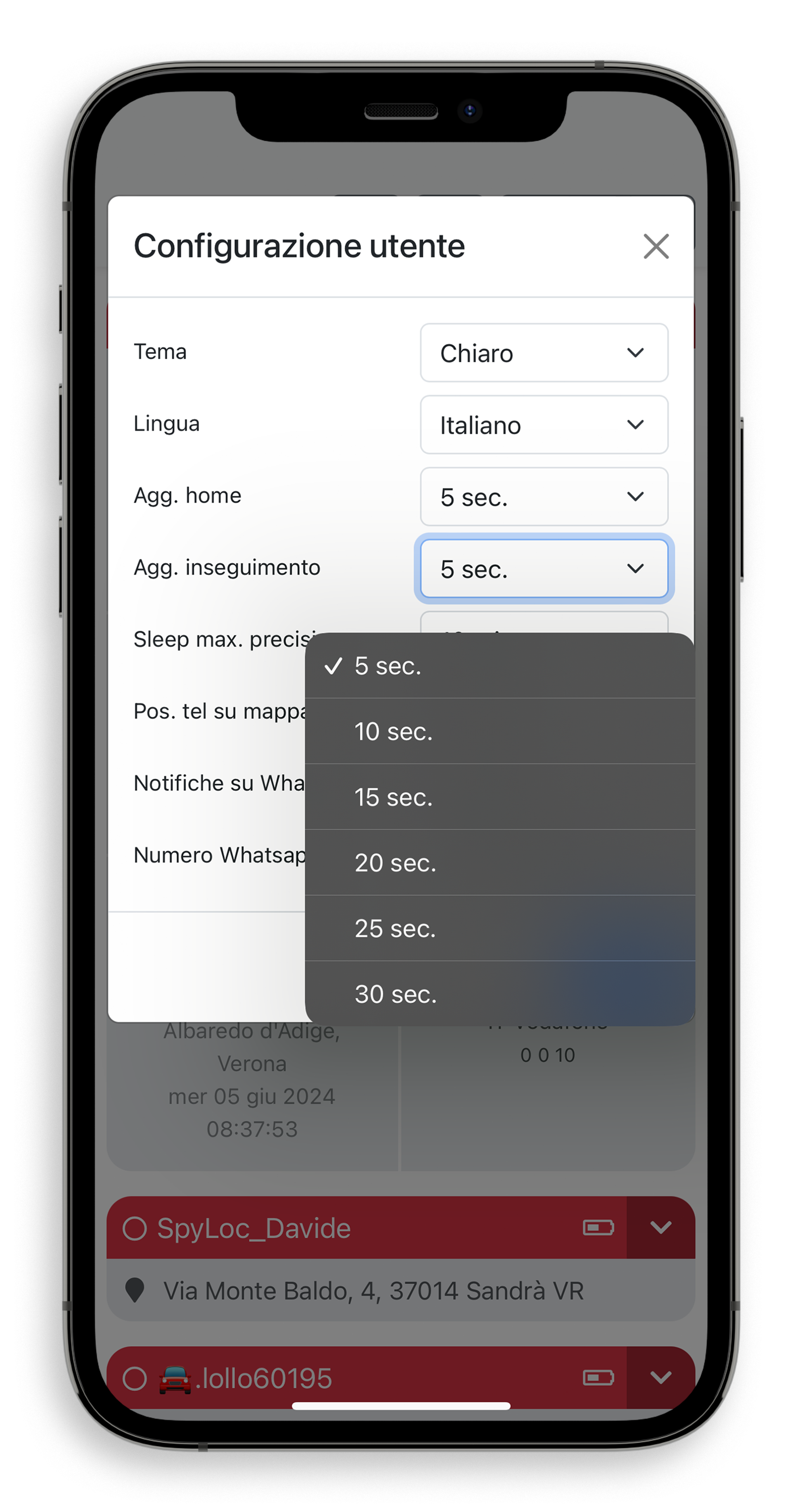 Possibilità di personalizzare la Modalità inseguimento selezionando la frequenza della posizione (5-30 secondi) o la modalità a basso consumo.